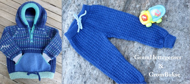 For å teste ut mønstrene mine på Grombuksa, GromHettejakka og GromHettegenseren har jeg strikket noen plagg som jeg har gitt til Jens. Jens er 2 år og bor i København. Buksa er ensfarget og matcher både hettegenseren og hettejakka. Håper klærne faller i smak :)